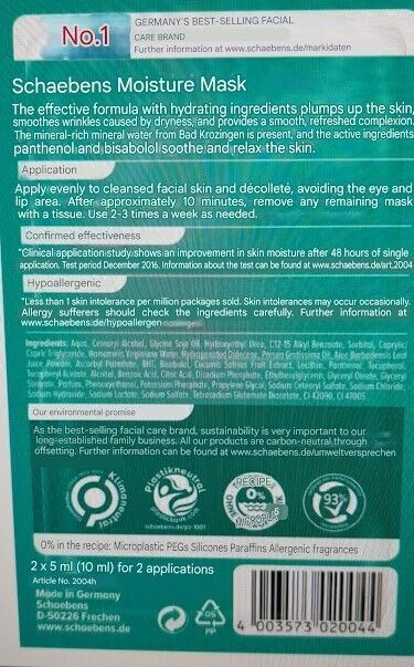 The Dr.Schaebens moisturizing masks really moisturize the skin and are a great value, definitely worth the money. Very good quality, easy and comfortable to use, I very much recommend them.