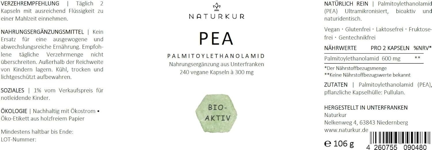 | Inhaltsstoffe | Palmitoylethanolamid (PEA), Pflanzliche Kapselhülle: Pullulan |