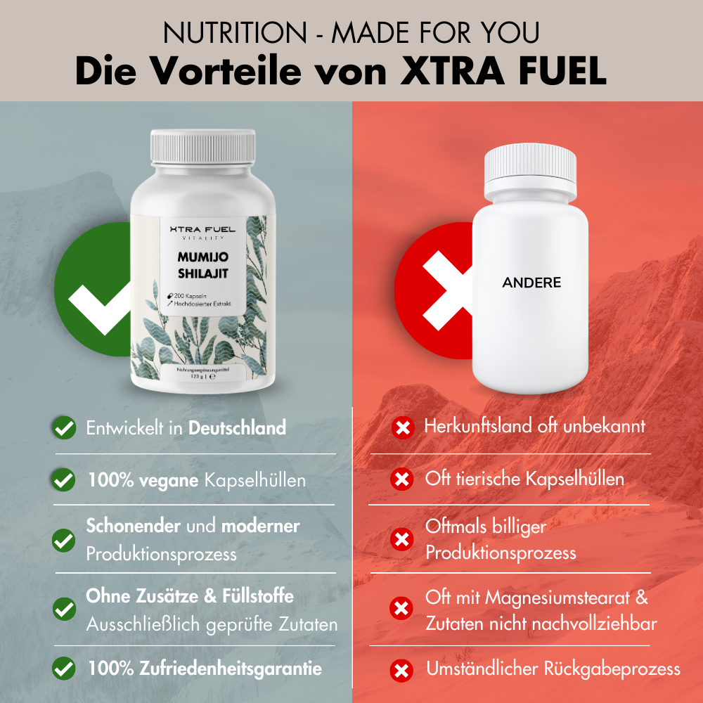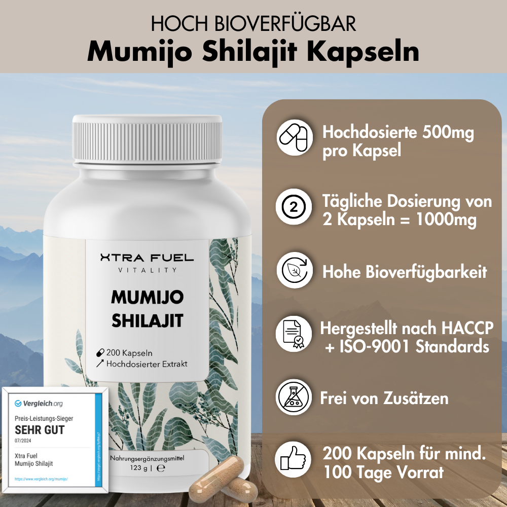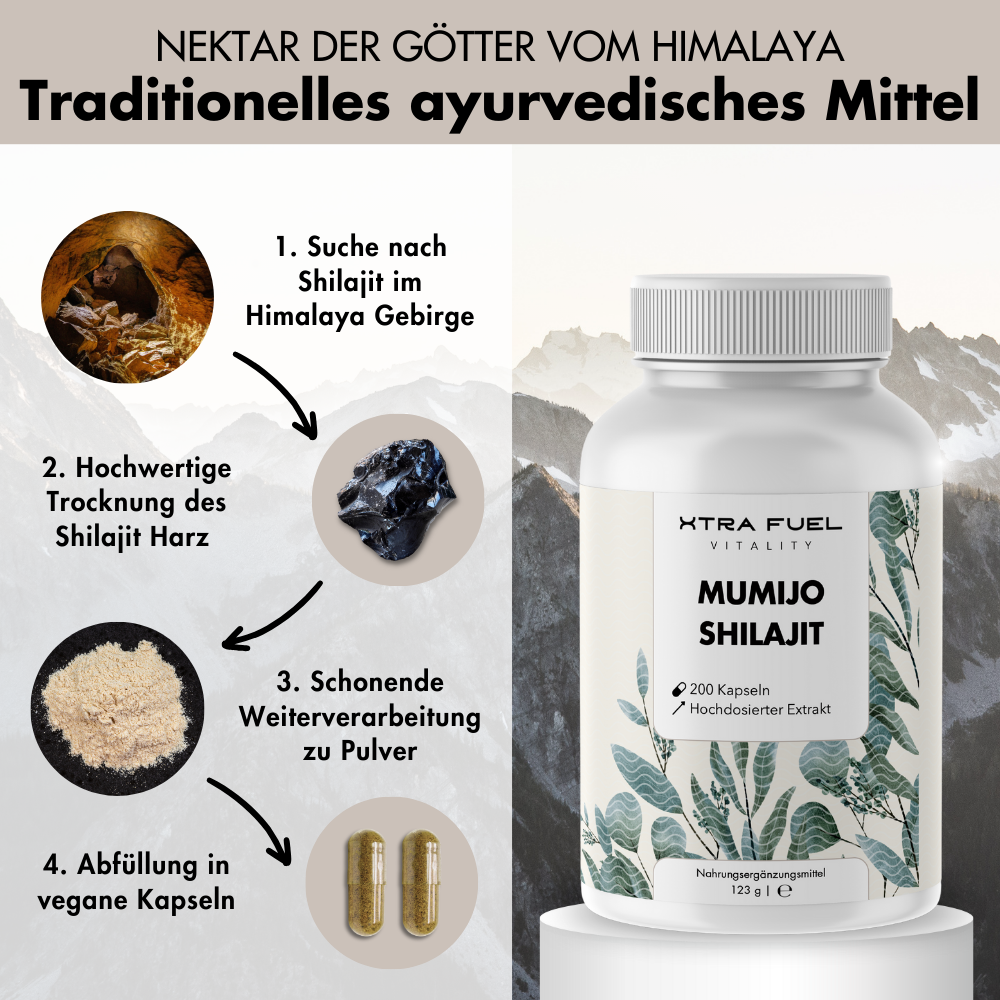 Unsere Mumijo Shilajit Kapseln sind das Ergebnis jahrelanger Forschung und einer sorgfältigen Auswahl der besten Inhaltsstoffe. Als deutsches Unternehmen legen wir höchsten Wert auf Qualität und Transparenz. Wir beziehen unseren Mumijo Extrakt direkt aus den unberührten Höhen des Himalayas, wo die Natur noch in ihrer reinsten Form existiert. Jede Dose enthält 120 Kapseln, die jeweils mit 500 mg Mumijo Extrakt gefüllt sind. Dies entspricht einem Vorrat für 60 Tage, wenn du unsere empfohlene Dosierung einhältst. Die Qualität unserer Produkte hat bei uns oberste Priorität. Daher werden alle unsere Produkte unter strengen Kontroll- und Zertifizierungsbedingungen in Europa hergestellt. Wir setzen auf Transparenz und Nachhaltigkeit, damit du genau weißt, was du einnimmst und woher es stammt.